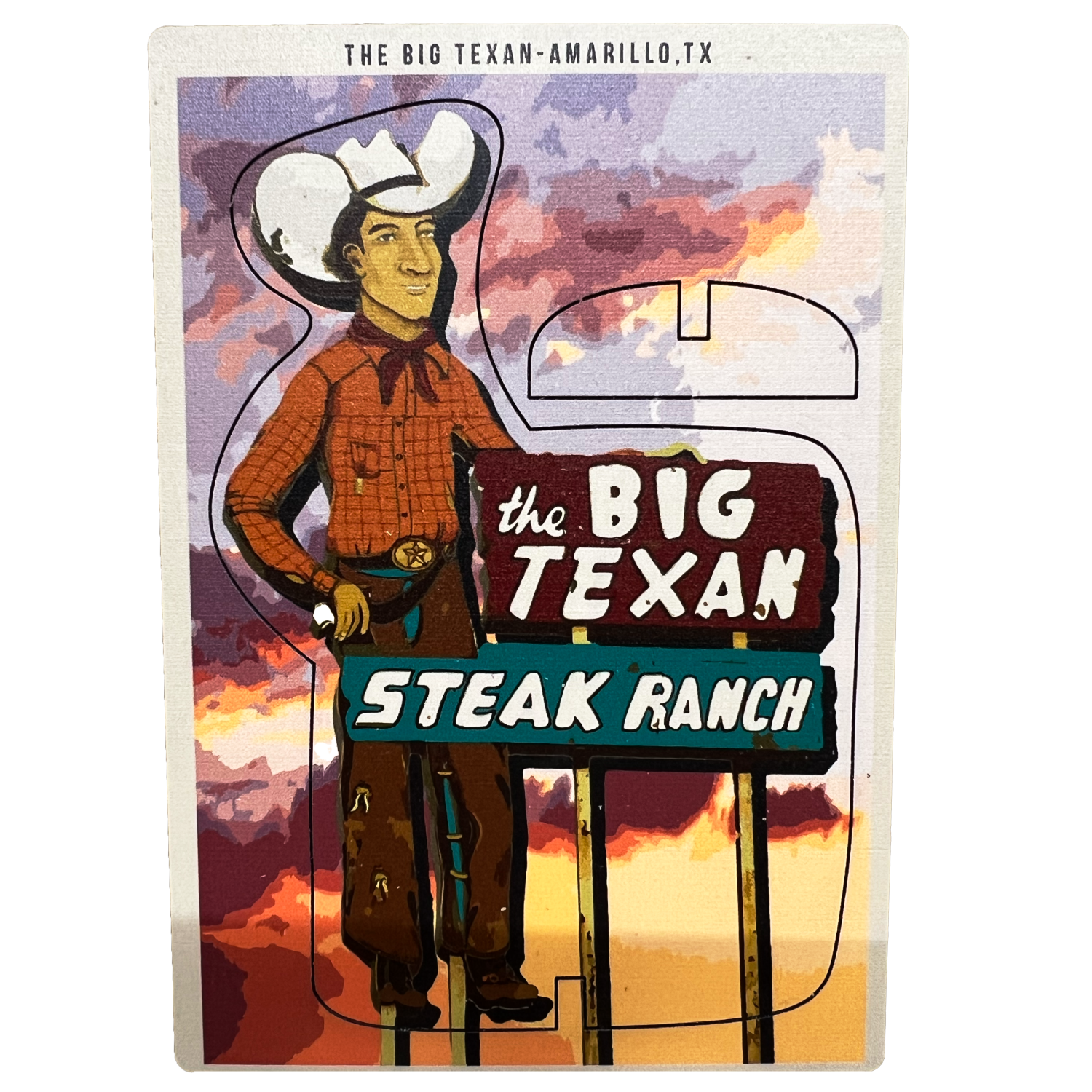 The Big Texan Wooden Postcard Cutout Cowboy is a distinctive keepsake that captures authentic Texas heritage. Crafted from quality wood, this novelty postcard features our classic cowboy sign. Perfect for collectors, travelers, or anyone seeking a unique memento of their Big Texan experience. Display it on a shelf, send it as a distinctive greeting, or add it to your Texas memorabilia collection.